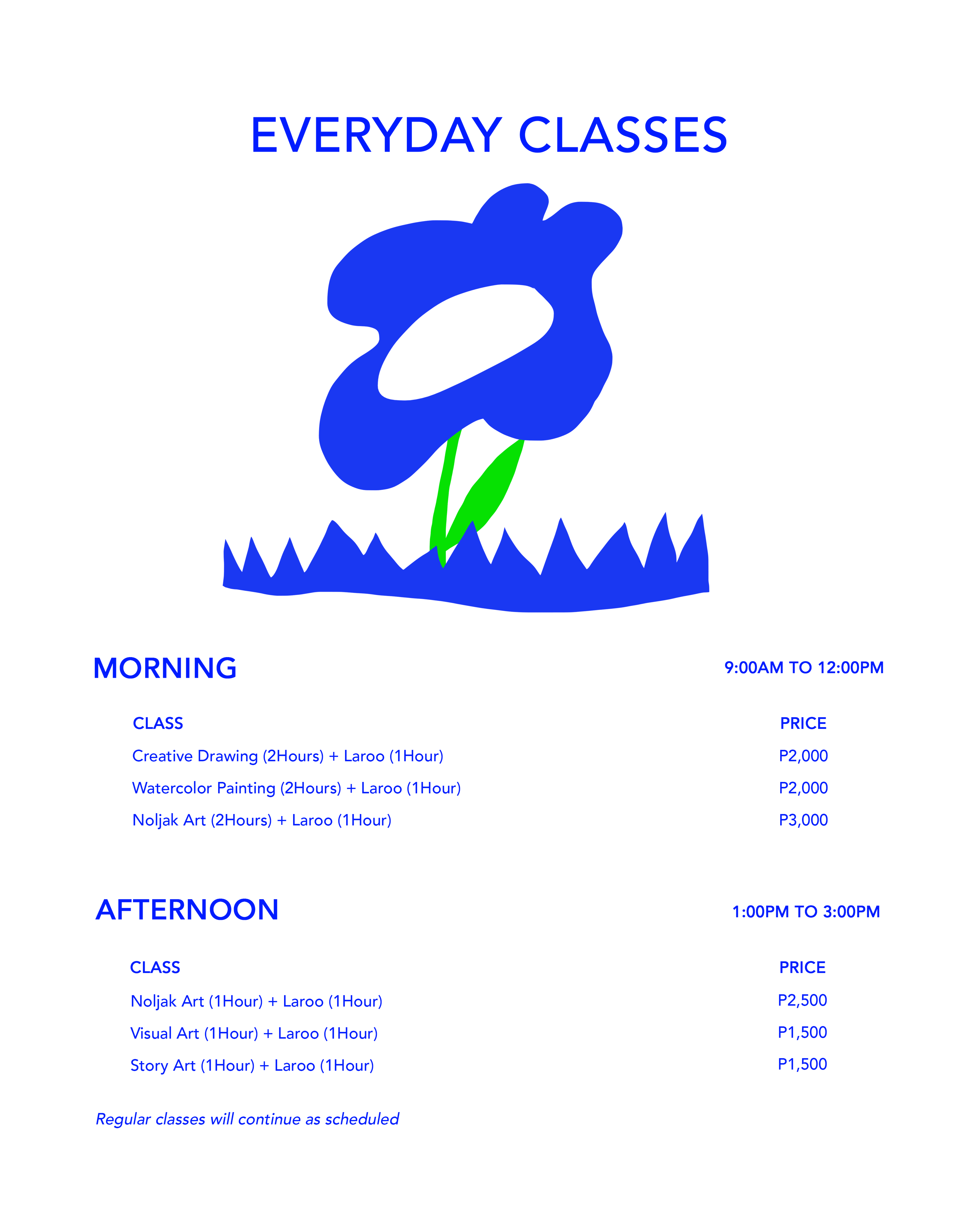 오전 수업(오전 9시 ~ 낮 12시)은 더욱 깊이 있는 창작 활동에 집중하기에 적합하며, 오후 수업은 보다 짧고 유연하게 참여할 수 있어 바쁜 일정에도 잘 맞습니다.